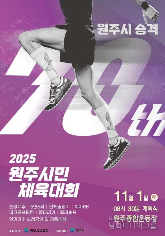‘2025 원주시민 체육대회’는 시 승격 70주년을 기념해 시민 간 소통과 화합을 도모하고, 지역사회 결속력을 강화하기 위해 마련됐다. 대회는 원주시체육회가 주최·주관하며, 오는 11월 1일 원주종합운동장에서 개최될 예정이다.