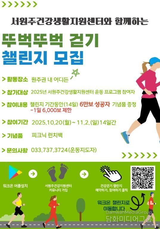 이번 행사는 올해 센터에서 추진한 운동 프로그램 참여자를 대상으로, 모바일 걷기 앱을 활용한 비대면 방식으로 진행된다. 휴대전화에 ‘워크온(Walkon)’ 앱을 설치한 뒤 ‘서원주건강지원센터 커뮤니티’에 가입해 뚜벅뚜벅 걷기 챌린지를 신청하면 된다.