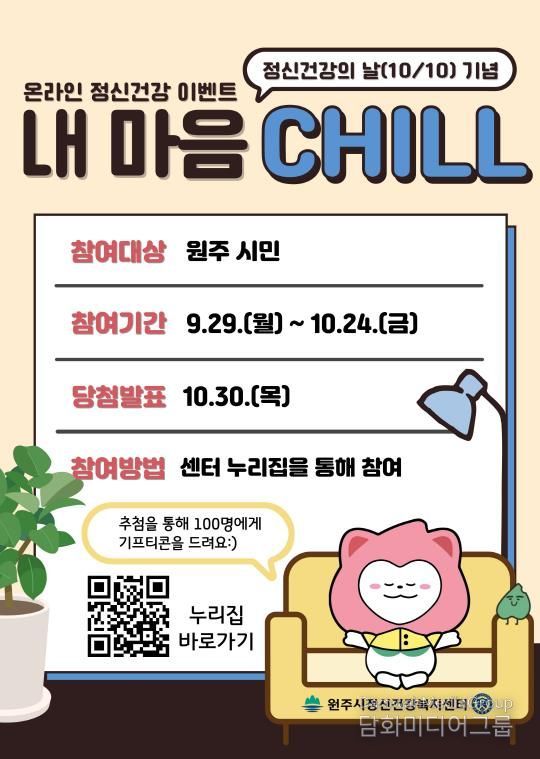 시민행정신문 강갑수 기자 | 원주시정신건강복지센터는 정신건강의 날(10월 10일)을 기념해 9월 29일부터 10월 24일까지 온라인 정신건강 이벤트 ‘내 마음 칠(CHILL)’을 진행한다.