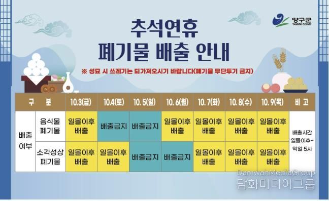 양구군은 연휴 기간 쓰레기 수거 일정을 사전 홍보하고, 포장지, 택배 상자 등 올바른 분리배출 방법과 1회용품 줄이기 등을 적극 홍보하여 생활 쓰레기로 군민들이 불편을 겪지 않도록 할 방침이다.