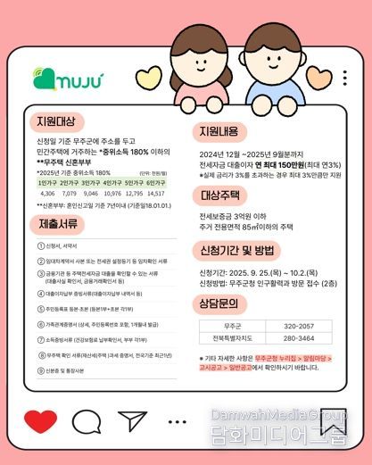 신청은 10월 2일까지 무주군청 인구활력과 청년정책팀에 하면 되며 신청서 등 제출 서류는 무주군 누리집 공고 게시판을 통해 확인할 수 있다.