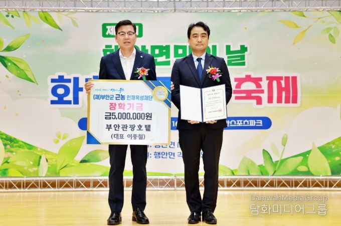 시민행정신문 강갑수 기자 | (재)부안군근농인재육성재단은 지난 26일 제16회 행안면민의 날 화합한마당 축제행사에서 부안관광호텔(대표 이종철)이 지역인재 육성을 위한 장학금 500만원을 기탁했다고 밝혔다.