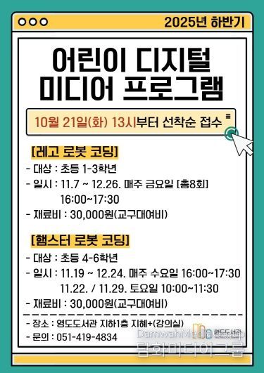 시민행정신문 강갑수 기자 | 영도도서관에서 어린이복합문화공간의 디지털 교육환경을 기반으로 관내 어린이들의 디지털 역량 강화와 창의력 향상을 위한 ‘2025년 하반기 어린이 디지털 미디어 프로그램’을 운영한다.