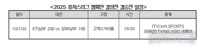 9월 29일(월) 열린 2025 퓨처스리그 챔피언 결정전 준결승전에서 남부리그 2위 KT는 북부리그 1위 한화를, 남부리그 1위 상무는 북부리그 2위 LG를 꺾고 각각 결승 진출에 성공했다.