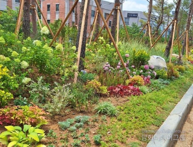 녹지대 하부는 말채나무, 홍가시나무, 자엽병꽃 등 다양한 화관목을 비롯해 개화 시기가 다른 초화류 30여 종을 식재해 사계절 변화에 따라 다양한 색감과 분위기를 느낄 수 있도록 구성했다.