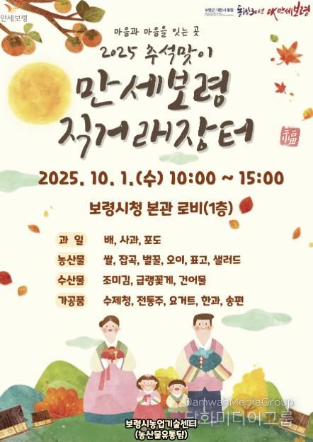시민행정신문 기자 | 보령시는 추석을 맞아 10월 1일 보령시청 본관 1층 로비에서 ‘2025 추석맞이 만세보령 농특산물 직거래장터’를 운영한다고 밝혔다.