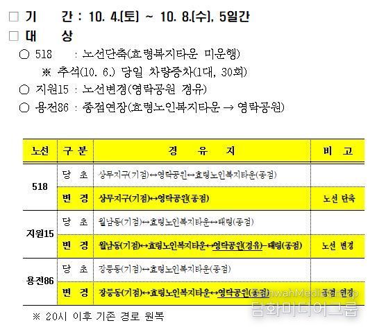 상무지구~종합버스터미널~영락공원을 운행하는 518번 시내버스는 추석 당일(6일) 30회 증차 운행하고, 월남동~태령을 운행하는 지원15번은 영락공원을 경유해 운행한다.