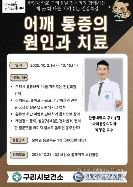 시민행정신문 강갑수 기자 | 구리시는 오는 10월 2일, 시민들의 근골격계 질환 예방과 건강관리 역량 강화를 위해 '어깨 통증의 원인과 치료'를 주제로 한양대학교 구리병원 마취통증의학과 박형준 교수와 함께하는 ‘나를 지켜주는 건강특강’을 구리시 공식 유튜브 채널(구리비전)을 통해 송출한다고 밝혔다.