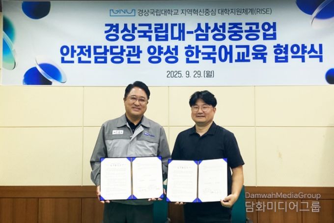 시민행정신문 이세훈 기자 | 경상국립대학교 RISE사업단 산학친화프로그램과 삼성중공업은 9월 29일 오후 가좌캠퍼스 언어교육실 국제교육부처장실에서 외국인 근로자의 안전한 근로환경 조성과 지역사회 정주 여건 조성을 위해 ‘외국인 근로자 대상 한국어 교육체계 구축에 관한 업무협약’을 체결했다.