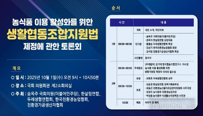 시민행정신문 이준석 기자 | 생산부터 소비에 이르기까지 친환경 농식품의 직거래를 도모하는 생활협동조합을 체계적으로 지원할 수 있는 법률 제정을 위한 토론회가 열린다.