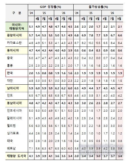 한편, 아시아개발은행은 한국의 ’25년 성장률에 대해서는 7월에 발표한 전망치인 0.8%를 유지했다. 7월 전망은 건설투자 감소, 수출 둔화, 부동산시장 약세 등을 반영하여 4월 전망에 비해 0.7%p 하향 조정된 바 있다. 아시아개발은행은 건설경기 부진, 미국의 관세 인상 및 관련 불확실성 등이 지속되면서 7월 전망치를 유지했으나, 정부의 확장적 재정정책과 완화된 통화정책은 하반기 내수 회복에 기여할 것이라고 평가했다. 아울러 ’26년 경제성장률도 7월과 동일한 1.6%로 전망했다.