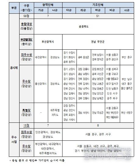 올해는 충청북도가 대통령상인 종합대상을, 부산광역시(광역자치단체 부분)와 전남 무안군(기초자치단체 부문)이 국무총리상인 부문별 대상을 받는 등 총 64개 자치단체가 수상의 영예를 안았다.