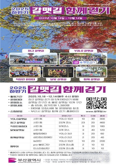 시민행정신문 강갑수 기자 | 부산시는 오는 10월 18일부터 12월 14일까지 두 달여 간 '2025년 하반기 욜로(YOLO) 갈맷길 함께 걷기 행사'를 운영한다고 밝혔다.