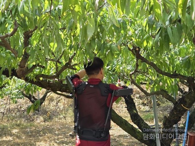 조끼형 구조로 설계된 이 장비는 반복적인 윗보기 작업이 많은 과수 전정·수확 과정에서 어깨 근력을 보조해 신체의 부담을 줄여주는 역할을 한다.