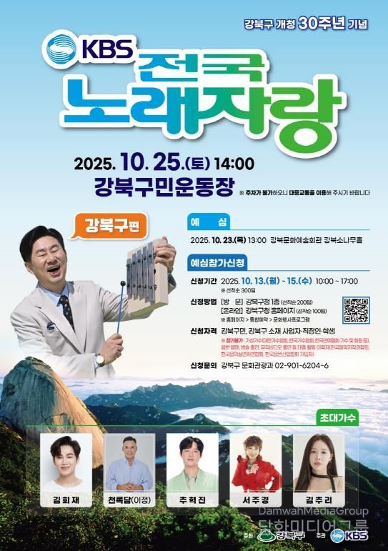 시민행정신문 이존영 기자 | 강북구는 개청 30주년을 기념해 오는 10월 25일 오후 2시 강북구민운동장에서 KBS 장수 예능 프로그램 ‘전국노래자랑’ 강북구편을 개최한다고 밝혔다.