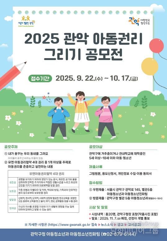 응모 기간은 오는 10월 17일까지이며, 참가 대상은 관악구 내 어린이집, 유치원, 초중고교에 재학 중이거나 관내에 거주 중인 5세~18세 이하의 아동과 청소년이다.