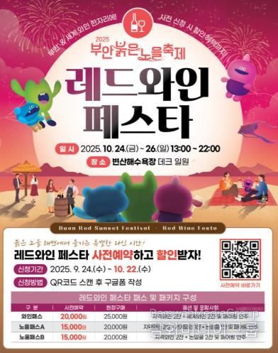 시민행정신문 강갑수 기자 | 오는 10월 24일부터 26일까지 변산해수욕장에서 3일간 열리는 2025 부안붉은노을축제'레드와인 페스타'와인패스 사전판매가 진행 중이다.