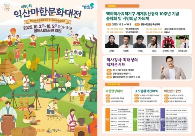 익산시는 1일 정례브리핑을 통해, 오는 3~5일 3일간 영등시민공원 일원에서 '제56회 익산마한문화대전'과 '백제역사유적지구 세계유산 등재 10주년 기념음악회'를 개최한다고 밝혔다.
