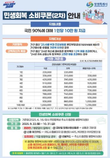 시민행정신문 기자 | 창원특례시는 추석 명절을 앞두고 민생회복 소비쿠폰 2차 지급을 통해 지역경제에 활력을 불어넣고 소상공인들에게 힘을 보내고 있다. 이번 2차 지급 대상은 총 91만 5,548명으로, 9월 22일부터 지급이 시작된 지 며칠 만에 벌써 84.5%에 해당하는 77만 3,719명이 발급받아 시민들의 높은 관심을 입증했다.