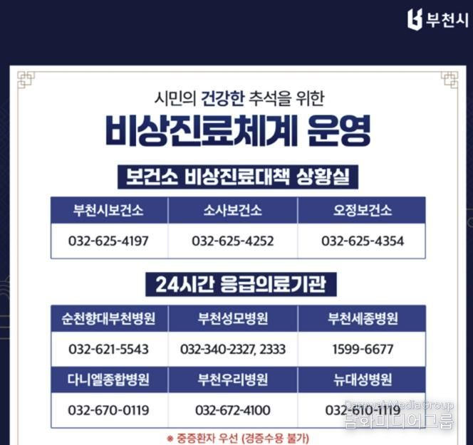 시민행정신문 기자 | 부천시는 추석 연휴 동안 진료 공백을 최소화하기 위해 관내 의료기관과 약국의 협력으로 비상 진료체계를 운영한다.