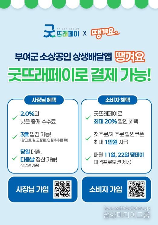 시민행정신문 이세훈 기자 | 부여군은 9월 30일부터 공공배달앱 ‘땡겨요’에서 굿뜨래페이 결제서비스를 시작한다고 밝혔다.