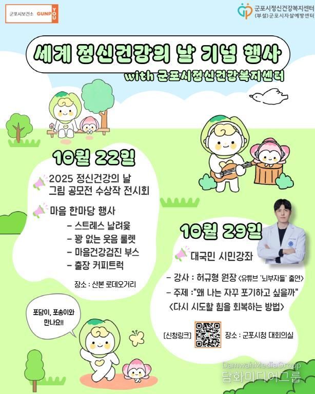 김미경 군포시보건소장은 “우울과 불안 등 정신건강 문제는 누구에게나 찾아올 수 있다. 이번행사를 계기로 시민들도 스스로와 주변사람들의 정신건강에 관심을 가져주시기를 당부드린다”며 “누구나 마음 편히 정신건강 서비스를 이용할 수 있는 계기가 되기를 바란다”고 말했다.