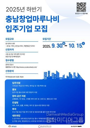 시민행정신문 강갑수 기자 | (재)충남창조경제혁신센터는 오는 10월 15일까지 2025년 하반기 충남창업마루나비 입주기업을 모집한다고 밝혔다. 이번 모집은 혁신적인 아이디어와 성장 잠재력을 지닌 스타트업을 발굴해 안정적인 보육 환경을 제공하고, 기업의 지속적인 성장을 지원하기 위해 추진된다.