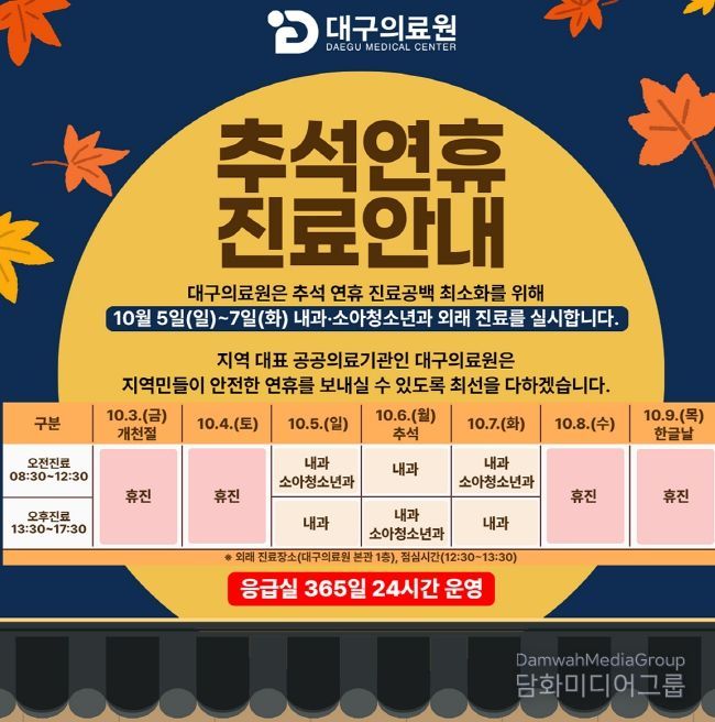 시민행정신문 강갑수 기자 | 대구의료원이 추석 연휴 기간(10.3.~10.9.) 응급실 운영을 강화하고, 10월 5일(일)부터 7일(화)까지 내과·소아청소년과 외래 진료를 실시한다.