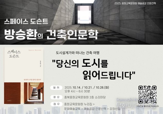 시민행정신문 기자 | 충청북도교육청 직속기관 중원교육문화원(원장 배상근)은 교육공동체 구성원들의 인문적 소양과 예술적 감수성을 높이기 위해 운영중인 문화교육 프로그램 '예술공감 인문산책'의 10월 강연 수강생을 선착순 모집한다고 전했다.