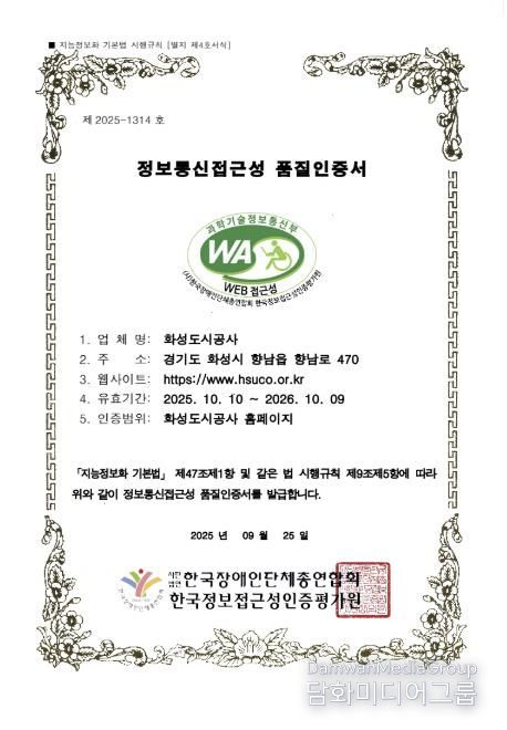 시민행정신문 강갑수 기자 | 화성도시공사는 시각장애인, 고령자 등 정보 취약계층도 불편 없이 홈페이지를 이용할 수 있도록 지속적으로 개선해온 결과, 3년 연속 ‘웹 접근성 품질인증마크’를 획득했다고 10일 밝혔다.