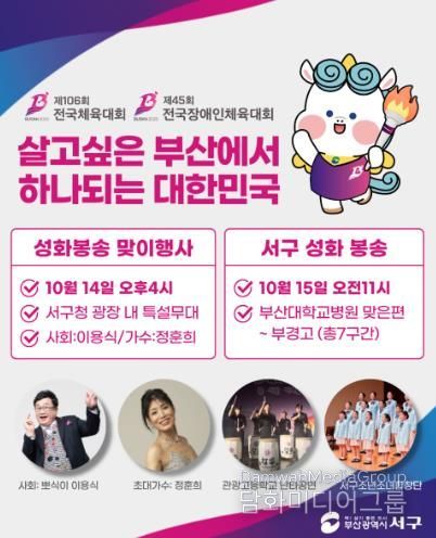 시민행정신문 강갑수 기자 | 부산 서구는 오는 10월 14일 16시, 제106회 전국체육대회와 제45회 전국장애인체육대회의 시작을 알리는 “성화의 불꽃, 하나되는 서구”를 주제로 성화봉송 맞이행사를 서구청 광장 특설무대에서 개최한다고 밝혔다.