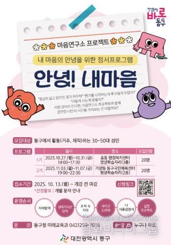 시민행정신문 강갑수 기자 | 대전 동구는 오는 13일부터 ‘내 마음의 안녕을 위한 정서프로그램’ 학습자를 모집한다고 10일 밝혔다.