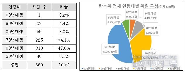 대통령 직속 탄녹위와 지방탄녹위 구성 현황을 출생연대별로 살펴보면, 전체 위원 660명 중 50~70년대생은 575명으로 87.1%를 차지한다. 50년대생(65세~75세)은 6.1%(40명), 60년대생(55세~65세)은 47.0%(310명), 70년대생(45세~55세)은 34.1%(225명)이다. 반면, 80년대생(35세~45세)은 8.3%(55명)이며, 90년대생(25세~35세)은 4.4%(29명)에 그쳤다. 청년 위원은 3.9%(26명)이다. 00년대생은 1명으로, 경상북도 탄녹위 소속이다.
