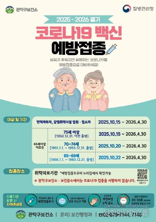 시민행정신문 강갑수 기자 | 관악구가 호흡기 질환이 증가하는 동절기 대비, 코로나19 감염 고위험군을 대상으로 코로나19 백신 무료 접종을 실시한다.