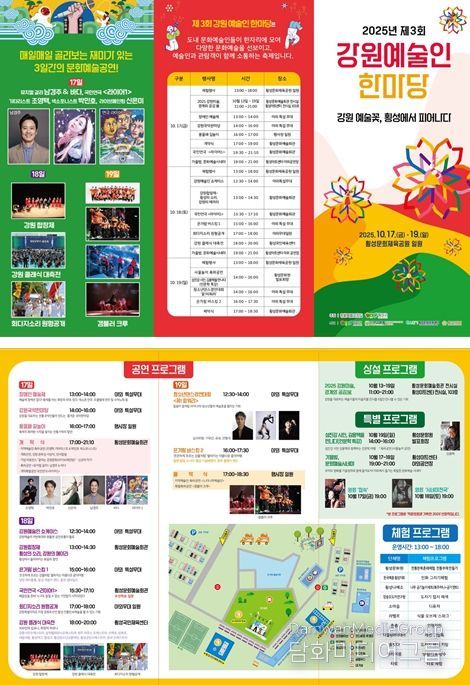 시민행정신문 강갑수 기자 | 강원예술인과 도민의 화합·소통·공감을 위한 '2025 제3회 강원예술인 한마당' 행사가 오는 10월 17일부터 19일까지 3일간 횡성문화체육공원 일원에서 열린다.