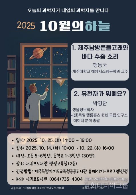 시민행정신문 기자 | 제주도교육청 서귀포도서관은 25일 오후 2시부터 서귀포도서관 평생교육실에서 한국도서관협회 및 ‘10월의 하늘’ 준비위원회와 함께 ‘10월의 하늘’ 프로그램을 운영한다.