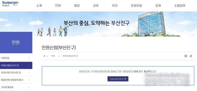 시민행정신문 강갑수 기자 | 국가정보자원관리원 화재로 국민신문고 시스템 장애가 지속되는 가운데 부산진구는 민원 불편을 최소화하고자 구청 홈페이지에 ‘민원신청(부산진구)' 창구를 10월 10일부터 운영하고 있다고 밝혔다.