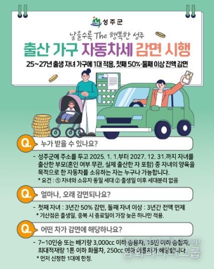 시민행정신문 강갑수 기자 | 성주군은 13일 올해를 포함해 2027년까지 자녀를 출산한 가구를 대상으로 자동차세를 50%(둘째 자녀 이상 전액) 감면한다고 밝혔다.