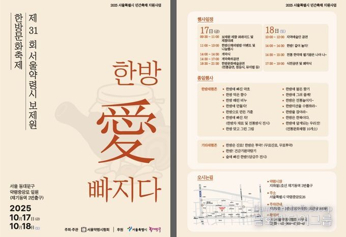 시민행정신문 강갑수 기자 | 서울 동대문구는 오는 17일부터 18일까지 양일간 서울약령시 일대에서 ‘제31회 서울약령시 보제원 한방문화축제’를 개최한다고 밝혔다.