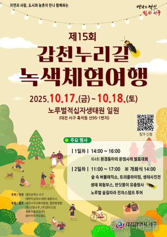 시민행정신문 김학영 기자 | 대전 서구는 이달 17일부터 18일까지 노루벌 적십자생태원에서 자연과 환경을 사랑하는 시민들을 위한 ‘제15회 갑천누리길 녹색체험여행’을 대한적십자사 대전·세종지사와 공동으로 개최한다.