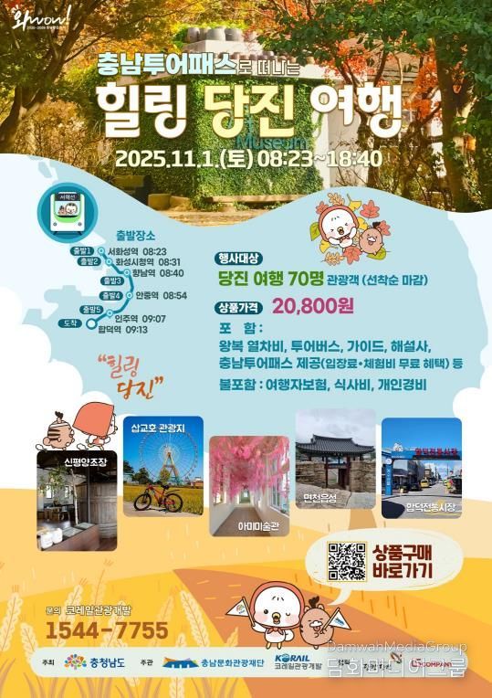 시민행정신문 강갑수 기자 | 당진시는 충청남도, 충남문화관광재단, 코레일관광개발과 협력해 충남투어패스로 떠나는‘힐링 당진 여행’ 2차 프로그램을 오는 11월 1일 운영한다고 14일 밝혔다.