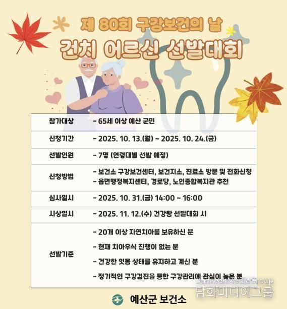 시민행정신문 기자 | 예산군보건소는 ‘제80회 구강보건의 날’을 맞아 건강하고 활기찬 구강생활 실천 분위기 조성을 위해 건치(건강한 치아)어르신 선발대회를 개최한다.