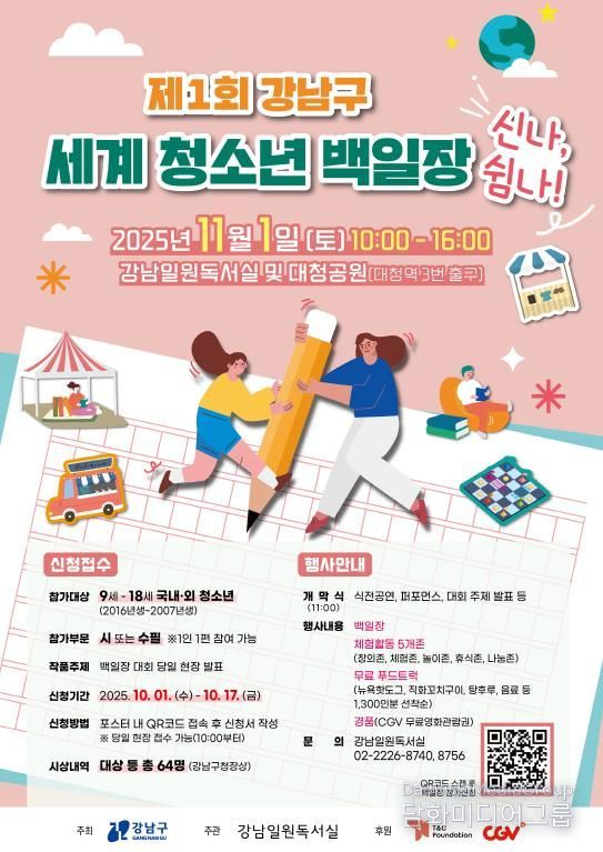 시민행정신문 이존영 기자 | 꿈이 모이는 도시, 미래를 그리는 강남구가 오는 11월 1일 오전 10시부터 오후 4시까지 강남일원독서실과 대청공원 일대에서 ‘제1회 강남구 세계청소년백일장 신나, 쉼나!’를 개최한다. 이 행사는 국내‧외 국적 청소년이 함께하는 전국 최초의 기초지자체 주관 백일장으로, 다문화 시대와 K-컬처 확산 흐름에 발맞춘 문학축제다.