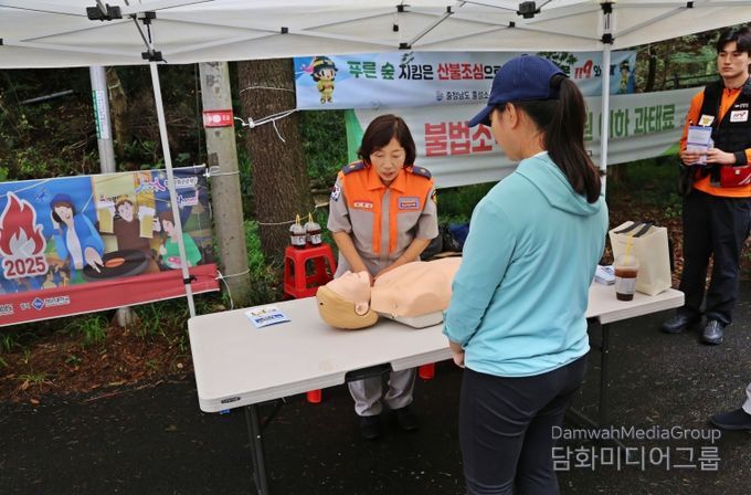 이번 행사는 가을철 등산객 증가에 따라 산악사고 및 응급상황 발생 시 신속하고 정확한 신고와 초기 응급처치의 중요성을 알리기 위해 마련됐다. 홍성소방서 구조구급팀은 현장을 찾은 등산객에게 119 신고 시 위치정보 전달 방법, 상황별 신고 요령 등을 안내하고, 심폐소생술(CPR)과 자동심장충격기(AED) 사용법을 직접 체험할 수 있는 실습 부스를 운영했다.