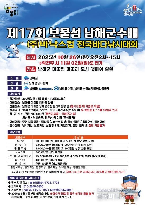 시민행정신문 기자 | 남해군낚시협회가 주관하고 남해군, (주)바낙스, 남해군수협, 남해동부어선자율어업공동체가 공동 후원하는 ‘제17회 보물섬 남해군수배 (주)바낙스컵 전국바다낚시대회’가 오는 10월 26일 오전 2시부터 오후 3시까지 남해군 미조면 도서 갯바위 일원에서 개최된다.(※ 악천후 시 11월 2일로 연기)