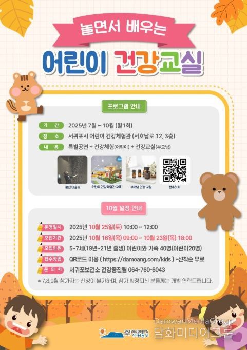 시민행정신문 기자 | 서귀포시는 10월 ‘어린이 건강교실’참가 가족을 모집하고 10월 25일 토요일 어린이 건강체험관·서귀포시 건강생활지원센터에서 운영한다.