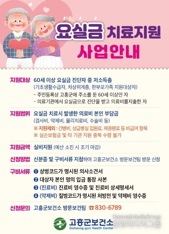 지원 대상은 고흥군에 주소를 둔 60세 이상 어르신 중 의료기관에서 요실금 진단을 받고 치료비를 지출한 ▲기초생활수급자 ▲차상위계층 ▲한부모가족 등 저소득층이다.