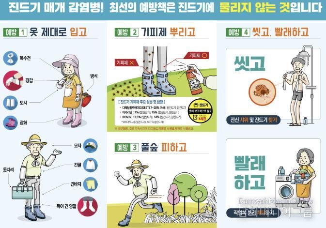 또한 진드기 기피제를 사용하고, 야외활동 후에는 입은 옷을 세탁하고 바로 샤워하는 것이 좋다.