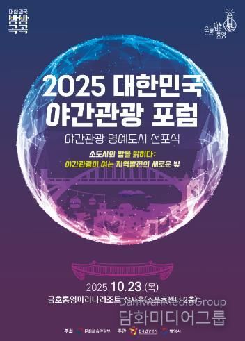 시민행정신문 강갑수 기자 | 통영시는 오는 23일 통영 금호마리나리조트에서 문화체육관광부가 주최하고 한국관광공사와 통영시가 공동으로 주관하는 '2025 대한민국 야간관광 포럼 및 야간관광 명예도시 선포식'을 개최한다.