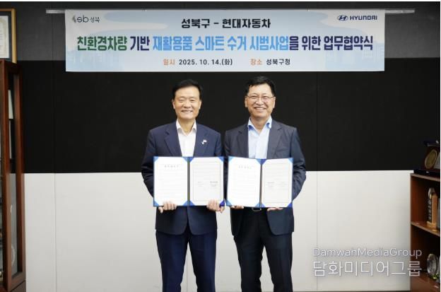 시민행정신문 강갑수 기자 | 서울 성북구 현대자동차와 ‘친환경 차량(ST1) 기반 재활용품 스마트 수거 시범사업’을 위한 업무협약(MOU)을 체결했다. 협약식은 10월 14일 성북구청 구청장실에서 이승로 구청장과 현대자동차 국내판매사업부장 김승찬 전무 등 시범사업 협력업체 관계자들이 참석한 가운데 진행됐다.